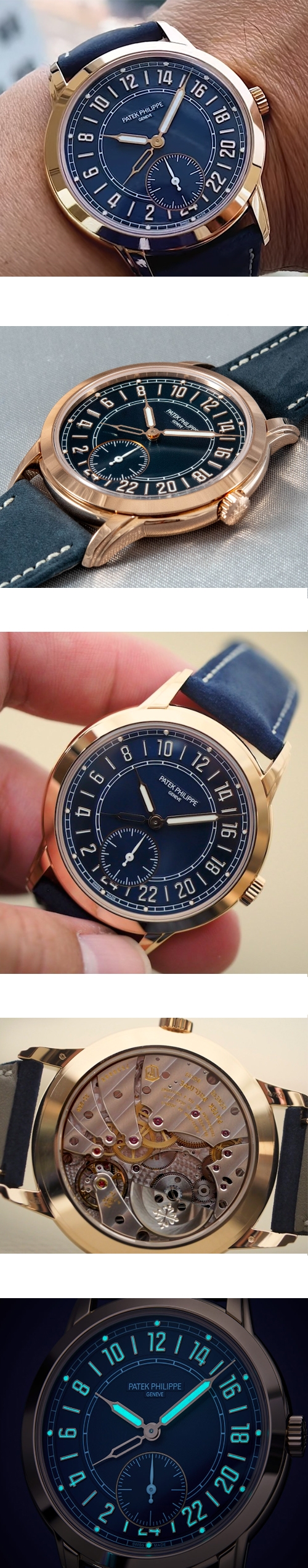 ストラップ/ブレスレット: ネイビーブルーのカーフスキン(ヌバック仕上げ)、コントラストの効いたクリームカラーのハンドステッチ、ローズゴールド製のプロングバックル